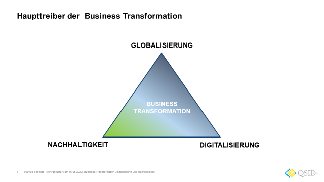Die großen Treiber der Business Transformation von Unternehmen sind Globalisierung, Digitalisierung und Nachhaltigkeit.