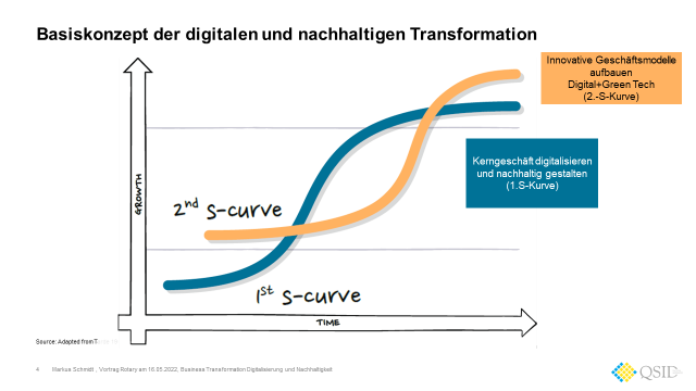 Für die erfolgreiche Umsetzung einer digitalen und nachhaltigen Transformation bei traditionellen Unternehmen stehen Führungskräfte vor der großen Herausforderung gleichzeitig das langjährige Kerngeschäft zu digitalisieren und nachhaltig zu gestalten(1. S-Kurve) und neues (digitales, Green Tech) innovatives/disruptives Geschäft (2. S-Kurve) aufzubauen.